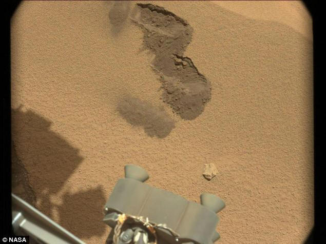 Лъскава измишльотина (в центъра на снимката) се появи там, където роботът зачерпнат за втори път Снимка: НАСА / JPL-Caltech / MSSS