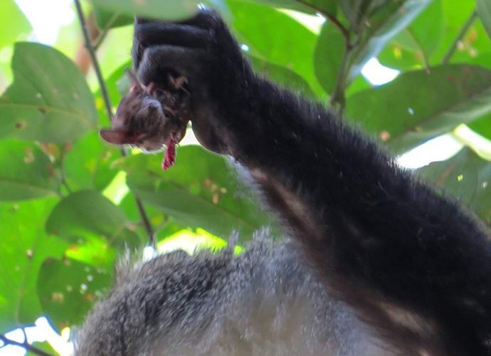 Наблюденията на зоолозите показаха, че ако синя маймуна забележи прилеп на дърво, след това в осемдесет и пет случая от сто ще може да хване жертвата. Прилепите понякога избиват от ръцете си хищници и се опитват да излетят, обаче маймуните отново се втурват за плячка с бойни викове. Приматите демонстрират истинска свирепост и кръвожадност.