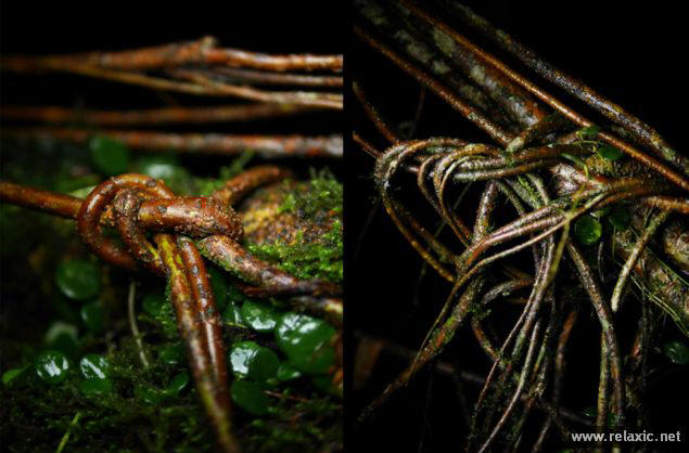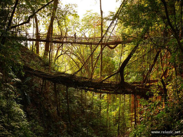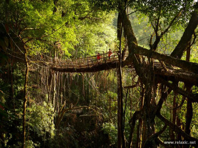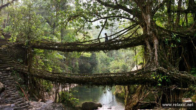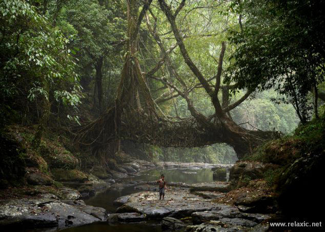 снимка с отворен код индийска държава Мегалая, разположена на в източната част на страната не напразно наричат дъждовното място в света – за 11 000 мм валежи падат тук и на практика вали ежедневно, което е абсолютен рекорд. Жителите вече са такива свикнали с капризите на времето, че чадърите са станали неразделна част дрехите им. Друга уникална държавна атракция са окачени мостове, изтъкани от корените на каучуковите дървета. Новозеландският фотограф Амос Чапъл съвсем наскоро посети Мегалай и донесе тези прекрасни снимки.