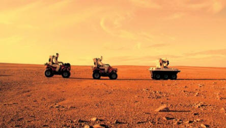 снимка Тестване на прототипи на марсиански автомобили с отворен код и скафандри в метеоритен кратер на канадския остров Девон (изкуствени цветове). Снимка: ПРОЕКТ HAUGHTON-MARS / P. LEE