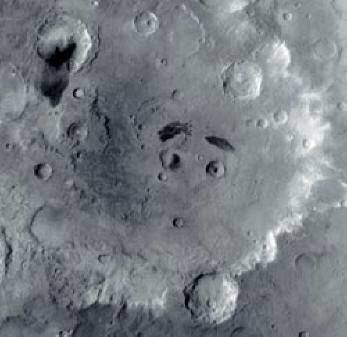 Валове от по-малки кратери, възвишаващи се над плоско дъно обширен кратер Тихонрав, служат като препятствия, с сблъсъци, с които вятърът губи сила. Пясък, носен от него остава близо до кратерите, където постепенно се образуват дюнови полета дюни. Тъмният цвят на тези пясъци се дължи на високото съдържание в те жлезисти съединения. Понякога в комбинации от кратери и дюни можете вижте забавни рисунки, като на тази снимка, където са разположени две близки кратери със същия размер заедно с тяхното допълнение “вежди” от тъмни дюнови полета създават цялостно впечатление изненадано лице, очертанието на което е вал на гигант кратера.
