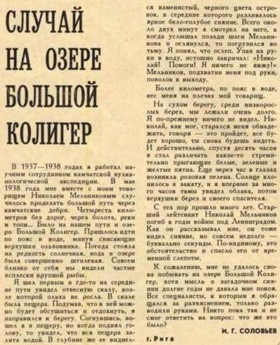 Едва през 1976 г. Игор Соловьов се осмели да опише случилото се в списание „Технологии – младеж“. Благодарение на обратната връзка от първата Камчадалов, той научи, че веднъж на брега на Големия Калигир Намирало се селище Ителмен на Канат, след което на негово място образува рибарско селище, но малко преди Великата Отечествена война войни Ителмен по неизвестна причина изостави домовете си и побързаха оттук.