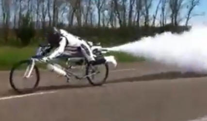 Французинът Франсоа Гиси реши да установи най-необичайното запис на скоростта. За това изобретателят построи велосипед с ракетен двигател и облечен с пълен мотоциклет. И не напразно – обикновено бавно движещото се превозно средство е било в състояние да се разпръсне впечатляващите 263 км / ч. Вашият запис вярно, не е регистрирано официално, Gissi настроен на магистрала без коли. Двигателят е построен от швейцарци Екзотична термотехника специално за този проект. Двигателят използва течен водороден пероксид като гориво – обикновен водороден пероксид, но в много по-концентриран форма от тази, която се продава в аптеките (90% за гориво и 3% за които можете да закупите в аптеката). Двигателят нагрява пероксида до високи температури и генерира поток гореща пара. Процесът възниква при температура 343 градуса по Целзий. скорост, постигнат на мотор Gissi, далеч надхвърля сегашния рекорд от 242,6 км / ч, който беше поставен през 2002 г. Но аз самата Французинът не бърза да нарича Краля на рекордите на Гинес. Fancy Records Records