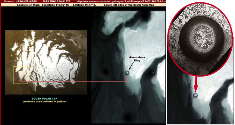 Орбитална станция на НАСА МРО (Марс разузнавателен орбитър) представи на учените и уфолозите още една загадка – снимка с Южният полюс на Червената планета, на който огромен кръгла вдлъбнатина.