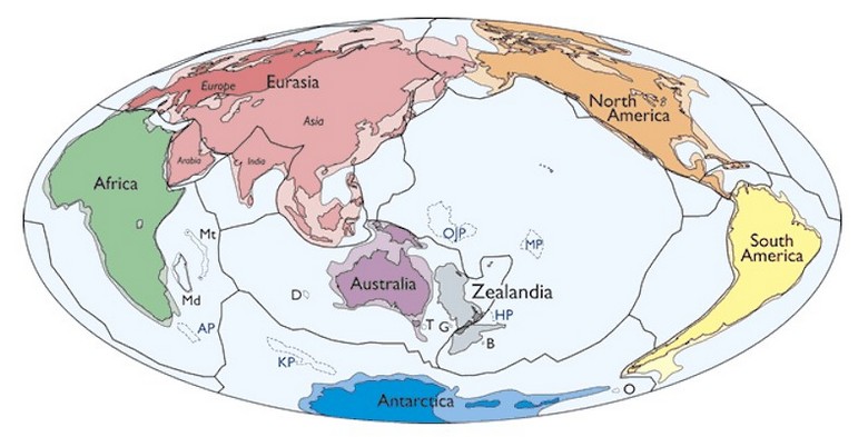 Според учените хипотетичната континентална част на Зеландия попада под Тихите води преди около 23 милиона години и той се откъсна от Австралия, превръщайки се в независим континент, не по-късно преди 85 милиона години. Възможно е в същото време се случило и нейното отцепване от Антарктида.