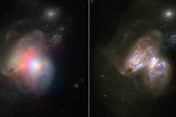 Снимки, направени с телескопа Хъбъл и ядрени Спектроскопичен телескоп NuSTAR от снимки, които снимат как двама се сблъскват галактики, в „сърцето“ на всяка от които са свръхмасивни черни дупки. Снимките показват две сблъскващи се галактики, 134 милиона светлинни години отдалечени от Земята. Общото им име – Arp 299, пише Rossiyskaya Gazeta. Черната дупка на една от галактиките расте поради абсорбция на газови облаци, втората дупка също е в покой или скрит от телескопи. приет резултатите ще помогнат на учените да разберат как може да повлияе синтеза на галактика до черни дупки и това, което ги кара активно да абсорбират всичко наоколо. Както FederalPress съобщи по-рано, в началото на януари астрономите на НАСА записа най-голямото отделяне на материя от свръхмасивно черно дупки в центъра на нашата галактика. Рентгеновата светкавица е била 400 пъти по-силен от обикновено.