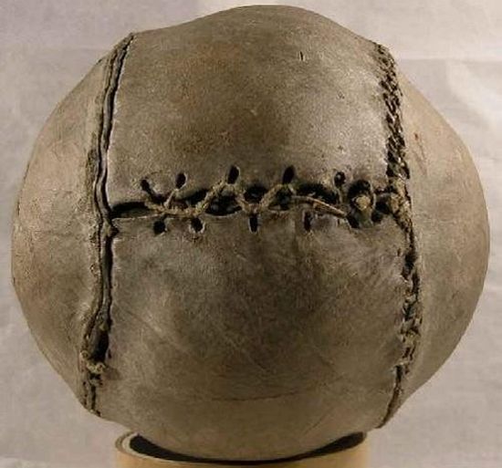 Тази обикновена топка е направена от свински мехур, в който опакована суха трева. Както можете да видите, технологията на производство на топки беше далеч от модерното, следователно качеството не е толкова горещо. въпреки че днес би имало много ловци, които да карат този древен топката. Е, да се направи, според мен, изобщо не е трудно, би било желаете.