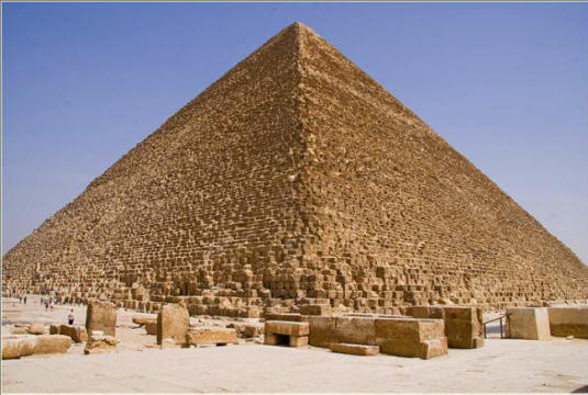 Най-известната, разбира се, е голямата пирамида на Хеопс в Гиза. Основата му е с размери 230х230 метра. височина първоначално беше 146,6 метра, но по някаква причина загуби първите си десет метра зидария (само от южната страна запазени няколко блока от следващия ред). Почти 300 кубически метра варовикови блокове, високи около метър и тегло около пет тона всяка, смята се, че са изчезнали вече в “нашите” време.