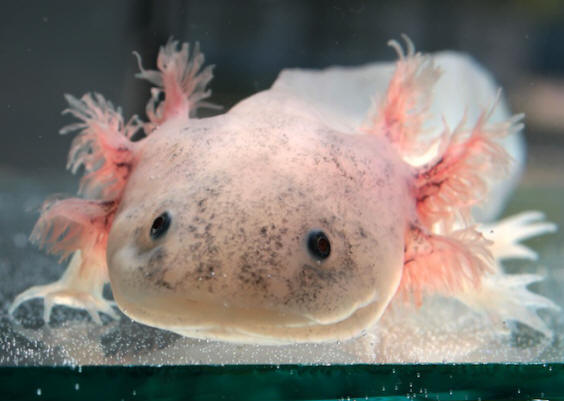 © Токио Морски живот парк / раздаване | Ройтерс Axolotl или Мексиканска амбистома (Ambystoma mexicanum). Тези саламандри бяха открит в района на езерото Джохимилко в Централен Мексико. розов кожа, голяма глава и усмивка им приличат на човек външен вид. Розови оборвания на главата – външни хриле.