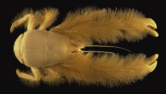 © Казаков Максим | Shutterstock.com Yeti Crab (Kiwa hirsuta). Тези същества са намерени едва през 2005 г. в района. хидротермални извори в океана на дълбочина повече от 2 километра, 1500 километра южно от остров Великден. Те получиха своето име заради дългите космати предмишници, които всъщност са са предни нокти почти два пъти по-голяма от дължината тяло.
