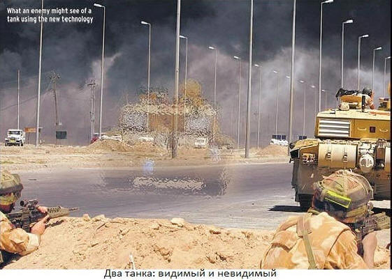През 2007 г. британците показаха невидим резервоар. Той беше покрити с плочи, всяка от които не беше нищо повече от параван. Десетки камери заснеха снимка зад резервоара и донесе я до екраните на чиниите. По искане на публиката танкът можеше направете го не само невидим, но и го превърнете в камион или автомобил, показвайки съответната картина на екраните. ефект беше страхотно.