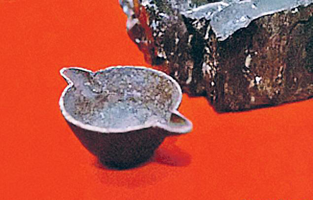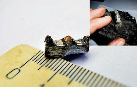 Внимателно счупи парче, отстрани грешното стъбло от него. форма, дълга малко над 7 сантиметра, цялата покрита с лепкава черни въглища. След контролно смилане под скала сребърен метал. Не беше магнетичен, беше мек и лек. Най-интересното беше, че при почистване на изложената пръчка зъби и разстояние между стъпките между тях. Находката много приличаше на зъбчатка метална релса, създадена изкуствено. Всичко изглеждаше така части, често използвани в микроскопи, различни технически и електронни устройства.