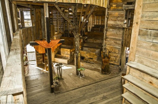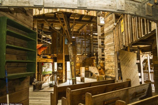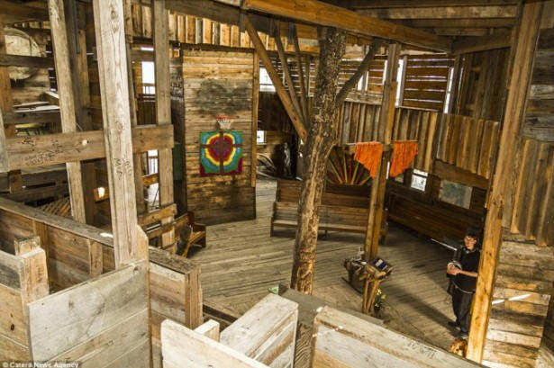 Снимка от открити източници Огромна дървена къща колосална покриващ площ от 10 000 квадратни фута (3400 квадратни метра) Хорас е много евтин. Той изхарчи само 12 хиляди долара благодаря икономичното използване на материалите и използването на отпадъците производство. Вътре в къщата спираловидни стълбища, олтар, баскетбол детска площадка и много стаи, коридори, проходи и балкони.