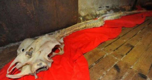 Странен скелет бе открит във вода на 28 март от китайски рибар, който, без да губи време, се обади на екип от местни новини и репортери се втурнаха да снимат създанието, изучавайки всичките му 153 ставата. Според японските новини находката предизвика голям интерес. обществена и тъй като цветът и формата на дракона изглеждаха почти перфектно, възникна мисълта, че костите може да са резултат ръчна изработка. От своя страна изследователите оспорват това. и декларират, че го смятат за естествен скелет бозайник, не едра риба, както някои предполагат.