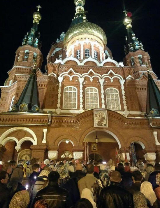 снимка от открити източници Снимки, в които над един от куполите храмът в близост със златен кръст е ясно видим пурпурен задвижване, направено в момент, когато току-що свърши религиозно шествие. В същото време митрополит Ижевск и Удмуртия Николай поздрави стотици хора на нашата планета, които се събраха близо до обичайния храм: “Христос е възкръснал!” Отговорът беше: “Наистина възкръснал!”
