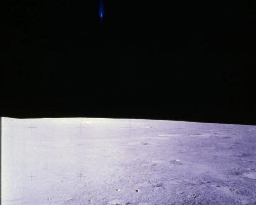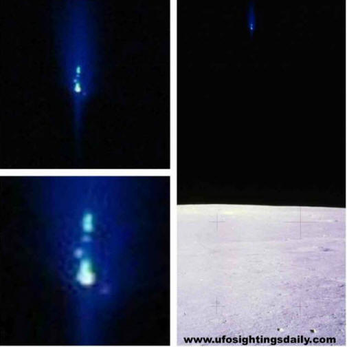 Този мистериозен синьо светещ предмет, висящ в атмосферата над повърхността на Луната, е открит от изследователи на снимки, направени от Аполон 14. Ако си припомните историята за няколко светещи топки, видени от астронавта Бъз (Едвин) Олдрин, възможно е наистина нещо да е имало на снимката място да бъде на Луната, а не пречка при фотографиране.