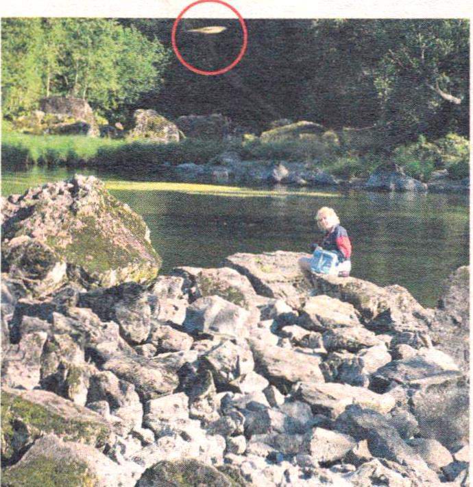 Разглеждайки впоследствие получени на ваканционни снимки, нашите героинята изведнъж видя нещо невероятно в същата тази снимка. Странна оранжева вещ виси над водата, подозрително наподобяваща “летяща чиния”, а на повърхността на езерото в далечината това петно от светлина беше заловено.