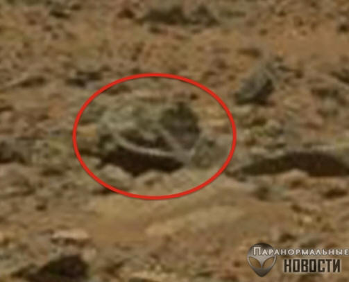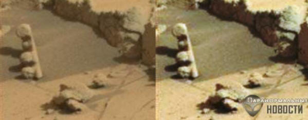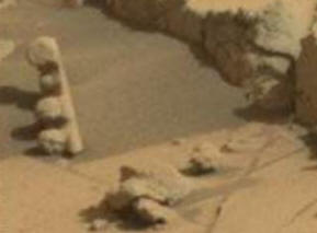И на снимката, направена на 753 марсиански ден, сигурна скулптура. Изглежда, че някога това е било барелеф. археолозите посочете плоска – ясно обработена – повърхност, от която този барелеф явно е паднал. Повърхностна форма точно повтаря гърба му – еднакво плоска основа.