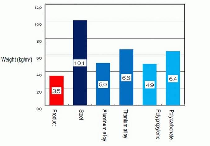 Освен това, според ръководството на Sekisui Chemical, новата пластмаса може да се получи като висока твърдост (тегло 3500 g / m2), и намалена коравина (тегло 2200 g / m2). За информация, стомана, използван днес за производството на автомобили, тежи 10 100 g / m2, с това е неговата твърдост на нивото на японската пластмаса.