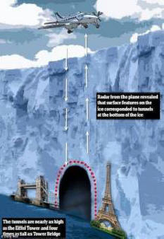 снимка от открити източници от Англия, открити в Ледени тунели в Антарктида с гигантски размери. Височина на канала дълъг повече от 100 километра е 250 метра. геолози успя да ги идентифицира под километров слой лед с помощта на радари сканиране.