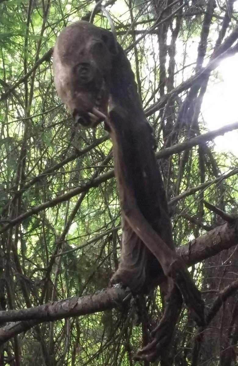 На един от иглолистните дървета имаше мумия на странно животно с малки размери. Изсъхнал труп беше окачен на клон бримка от дебела жица, в която беше забита главата неизвестно създание. Явно това същество е било удушено от някого. ТУК. Какво е това същество и кой го е убил?
