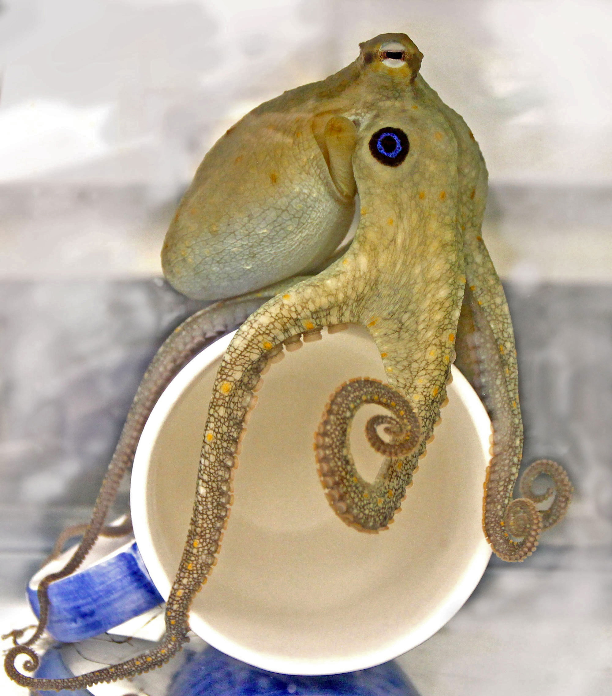 Октоподът опитва чашата. (Лена ван Гизен).