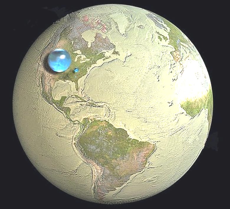 По едно време Интернет обиколи „реконструкцията“ на Земята без вода – т.е. един вид неравномерен космически блок с планински “шишарки” и океански “дупки”, по някаква причина се превърна във вирусна картина, така че като мирянин – в края на краищата, оказва се, колко неравномерен нашата планета! Но обърнете внимание на количеството земна вода (снимка отдолу, където голямата топка е цялата солена вода на Земята, малката е цялата пресен) в сравнение с неговата маса. Представете си и земята с диаметър почти 13 хиляди километра (12 742 км) и колко дори най-високата планина на Джомолунгма (Еверест) може да се открои 9 км и най-дълбоката Мариинска депресия 11 км. как казват експертите, футболна топка, която ни се струва напълно кръгла, много по-неравномерно в обиколката от нашата планета.