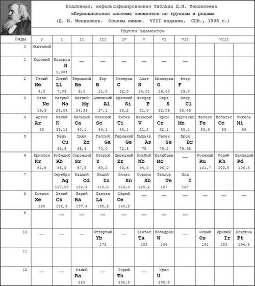 Така че, когато някой днес каже в учебниците химията публикува фалшив, това не е напълно вярно. Публикувана е почти първата версия на таблицата на брилянтен учен (и нула) групата без Нютония се премести до края), което се оказа повече безопасен за мощните, защото откриването на етер напълно зачеркна идеята за структурата на Вселената и заплашени от загуба на власт на световните магнати. Точно същото се случи с открития в енергийното поле на Никола Тесла и неразпознат (положен под кърпата или като цяло набързо унищожени) изобретения на други гении, за които ние дори не чух.