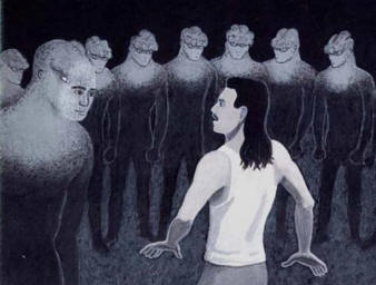 Една от рисунките на Джим, представяща срещата му с извънземни Най- сичко започна около 3:30 сутринта. Събудих се от слаб, бръмчащ звук. В същото време сучех под лъжицата сърцето ми започна да бие по-бързо, а главата ми пулсира. Скоро бръмченето се превърна във вой и звукът стана оглушително силен. и зглежда ме парализира, изпаднах в припаднало състояние. Иизведнъж почувствах, че се издигам над леглото, видях това Приближавам се към стената, която става прозрачна, изчезва и аз “плувайте” през него. Тогава умът ми напълно се изключи. Събуждайки се, видях, че съм на 35 метра над земята и бавно Слизам. Под мен беше изоставен увеселителен парк. А з съм прелетя над големите руски пързалки, “и не се страхувах Чувствах се спокойна и спокойна, а полетът дори достави Доволен съм. Скоро бях на седем до осем метра от земята, тялото ми взе вертикално положение и започна да се люлее, като махало. Тогава видях очертанията на около десетина големи същества, стоящи в полукръг. И въпреки че още не беше зората, аз разгледах: те бяха хуманоидни, само много големи. В някои в момента, в който отново изгубих съзнание. Извънземният кръг влиза аз се озовах сред дванадесет хуманоиди, се заселили на земята в почти порочен кръг. Техният растеж достигна два метра и всички те гледаха единия, който стои отляво от мен. Единственият източник на светлина беше лицето на този извънземен, наподобяващи ярко светеща холограма на човешко лице, наслагвана върху неговата физиономия. Това вероятно беше направено в ред да скрие от мен истинския си вид. Но когато чужденец отвори уста, не се чуха звуци, а глас, който аз възприемана телепатично, не беше съгласна с движението на устните.