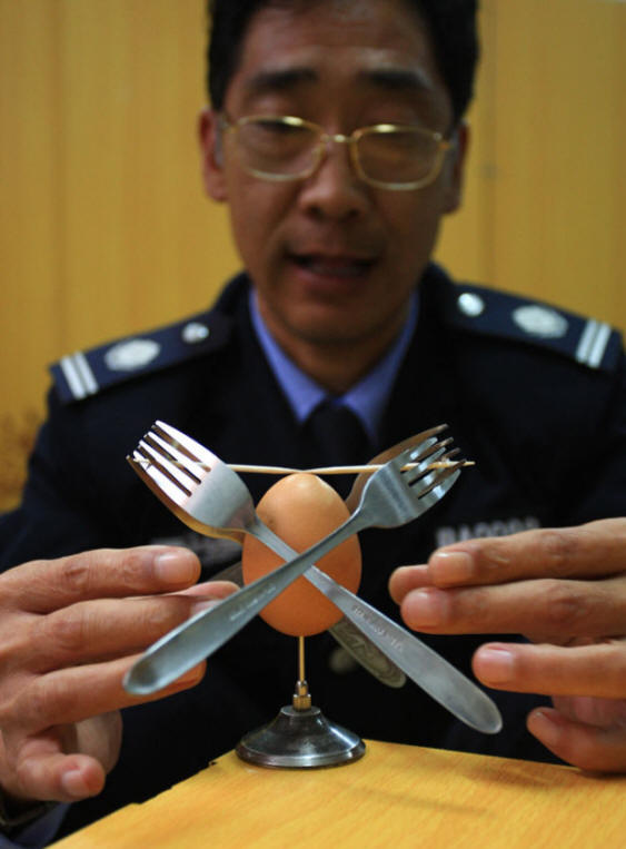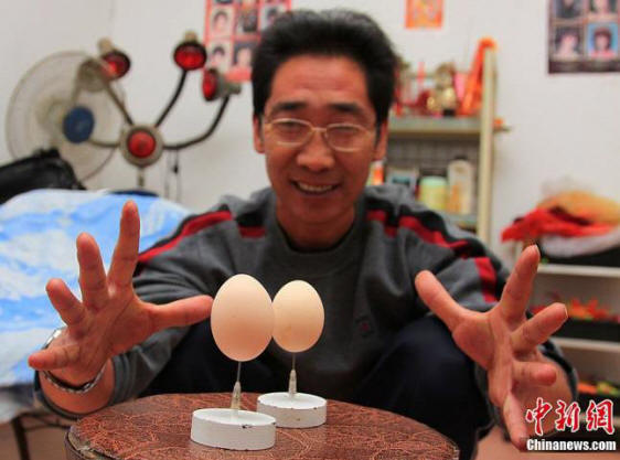 Няма видео под Tsui слага щраусово яйце на върха на иглата. Но как виждате на снимката, той е в състояние да направи същото с всякакви яйца птици. Цуй гордо декларира, че щраусовите яйца са най-големите яйца по света и никой друг не може да ги слага точката на щифта, за да не падне.