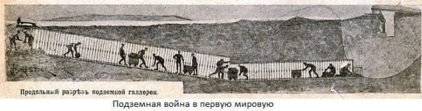 Връщане към традициите на подземните войни в такава ситуация Беше съвсем естествено. През 1916 г. британците организират 33 тунелни компании наброяващи 25 хиляди души. Копаят като под методът за пречупване на защитната линия на противника се използва и в руските армия и на немски език.