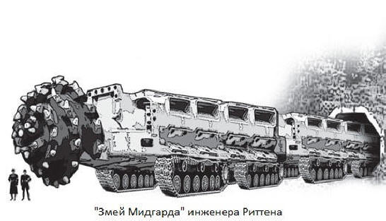 По-щастлива беше съдбата на проектанта Ритън. независимо от Верн през 1934 г. той разработва своя собствена версия на ъндърграунда, призовава неговата „Змия Мидгард“, планирайки кола предимно за нападението Френска линия Мажино. Проектът на Ritten беше поразителен по обхват. „Змията“ беше цял влак на 500 м от купета с размери 7м на дължина, 6 м ширина и 3,5 м височина със спалня за 30 души, три сервиза за ремонт, радиостанция, кухня и спасителна машина лодка за излизане на повърхността.