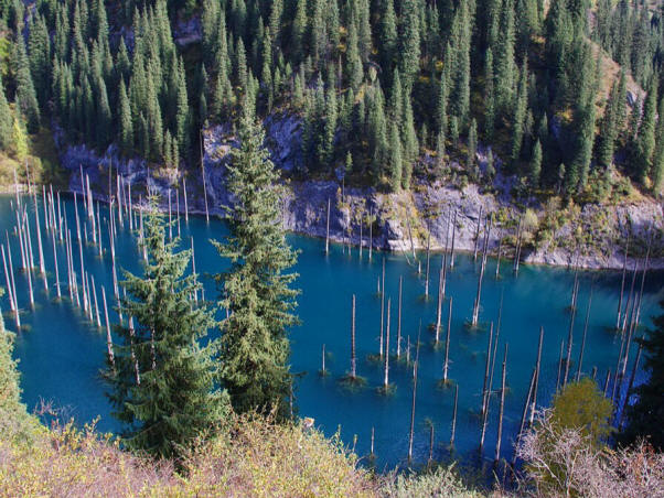 Снимки от отворен На Земята има много невероятни, красиви и мистериозни източници. Места! Тук, в Казахстан, на надморска височина от 2000 метра е великолепната красота на езерото Kaindy. Водата в това езеро е бистра и необичайно тюркоазено. Въпреки това езерото се нарича “мъртво”. В него не риба е намерена, а насред нея стои мъртва гора. Факт е, че в Земетресение е станало през 1910 г., поради което свлачищата са блокирани Ждрело. И планинската река я напълни с вода заедно с иглолистна гора, който е израснал тук веднъж. Затова понякога се нарича това място “Ударена гора.” В езерото има много студена вода. Това е за това причината стволовете на дърветата да са добре запазени, както и иглите под вода. В езерото се вливат два потока, които образуват малки водопади край брега.