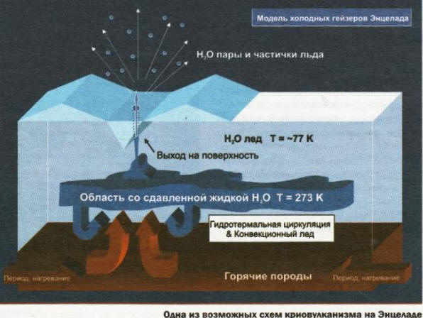 Когато бяха открити ледените гейзери на Енцелад, той се появи пълна изненада за планетолозите, защото вулканична дейност по сателит с диаметър само петстотин километра противно на теорията. По всякакъв начин толкова малък планетоид отдавна е имало вече би трябвало да са изстинали и замразени до най-дълбоките недра.