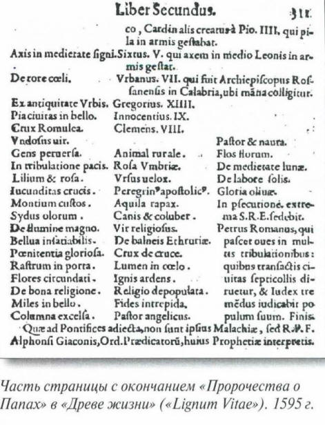 Снимки от отворени източници Арнолд де Вийон не беше човек наивен. Възстановявайки се от невероятна находка, той се изложи се съмнява в автентичността на текста, който го е ударил: не е ли под вековна прах някаква измама? Неговите съвременници – Бенедиктинските монаси нетърпеливо приеха предсказанията, които вече се отнасяха минали събития. Но големият въпрос е: как е църковната общност ще се отнася до частта, която съдържа прогнозите за идването събития? В крайна сметка Малахи почина преди петстотин години, името му е почти забравено, т.е. и духовенството, дори да са мислили за него, то във връзка с неговото необичайно гледки. В очите на католическата църква неговата дейност се носеше сянката, както биха казали сега, отпред. Така че можете ли да се доверите откровенията на този светец, който притежаваше определението папско господство, съответстващо на латинското “природата е извратена” ?! Два аргумента обаче разтърсиха съмненията на Вийон. В края на 16 в. когато той отърси праха от труда на Малахия, борбата в Европа едва отшумя с еретици, за които обвиняваха верните последователи на папството извращение на истинската вяра. И в ръкописа Вилън намери думите, предсказвайки тази битка пет века преди истински събития! Друг аргумент беше афористично формулираното бъдеще. От 78-ия папа – Лъв XI, от който Арнолд дьо Вийон би могъл да прецени като съвременни. В пророчеството на Малахия този папа бил наричан „Човек вода. “Лъв XI управлява за много кратко време – не повече от месец, но според Библиите, водата – символ на несигурност, кратка продължителност … В пет години след като Арнолд де Вилон открива ръкописа на Малахия, той публикува книга, посветена на неговата находка – „Пророчества за Папах. “Католическият Рим обаче не одобри тази публикация и откритието на монаха остава забравено в продължение на много години. Прогнози за малахия Сега, след известно време, е любопитно да прочетете характеристиките на Малахия Папи, които поведоха католическото стадо. И така, за папа Урбан VIII (първата половина на 16 век) светецът казва: „Лилия и роза“. това формула обозначава основното събитие на европейско религиозен и политически живот от този период – примирението на англичаните Протестантите, чийто символ беше розата, с френски Католицизмът, символът на който е лилия. Помирението стана от сключването на брака на крал Чарлз II и Мария Антоанета, дъщери на Хенри IX.
