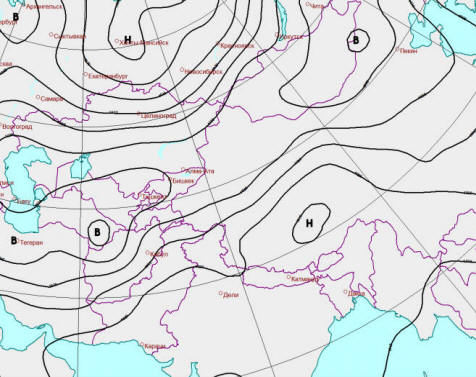 Снимка от отворени източници Sputnik “Aqua”, 08:45 GMT 13 Януари 2013 г. © MODIS | НАСА Причината за прашната буря беше разделяне на азиатския антициклон на две ядра. Основен център остана над Монголия, с леко изместване на югоизток и вторият, само малко по-малко мощен, възникна над Иран. Карта на времето за 06:00 GMT на 16 януари 2013 г. © Gismeteo Именно той създаде големи градиенти на атмосферното налягане между студения континент и топлите води на Арабско море. Искам да компенсирам това отличие, студен континентален въздух с висока скорост на юг, издигайки се в пустините на Иран, Афганистан и Пакистан прашни бури.