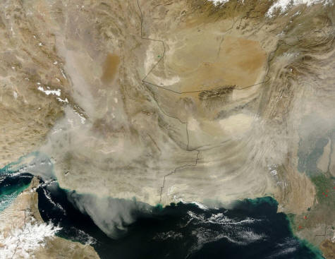 Средата на януари е белязана от голяма прашна буря, която заля страни от югозападна Азия, разпространяващи се до Арабско море и следователно се вижда дори от космоса. Силен вятър, типичен за от това време той вдигна в атмосферата тонове прашна пясъчна суспензия, което засенчи небето и значително влоши качеството на въздуха.