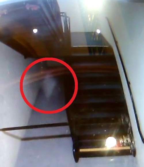 Като включите видеото по-долу, можете да видите мистериозен блед силует, бавно движещ се под стълбите. Той е прилича на стереотипен призрачен трафарет с дълга опашка вместо крака, къси ръце и голяма глава.
