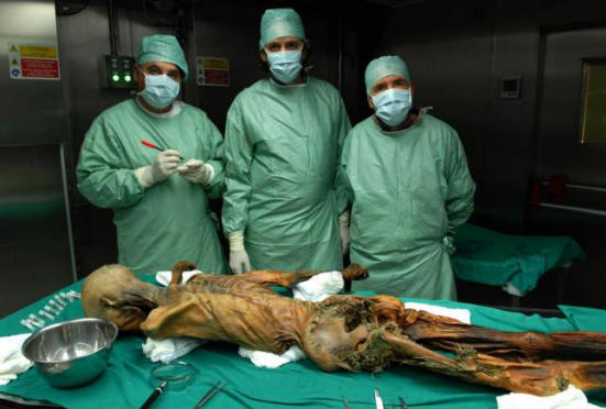 Снимка от открити източници Сега леденият човек се съхранява в специално изграден музей в Болцано. За по-добро съхранение в хладилното отделение се поддържа постоянно при температура от -6 ° C и влажност 99%. Мумията се изважда всеки месец дори след внимателно инспекциите се напръскват с дестилирана вода, която замръзва и образува тънка защитна кора от лед. ЗАЩО Умира ОТЗИ? Учените се опитаха да установят причината за смъртта на Ледения човек в Юни 2001 г. Мумията беше размразена и по време на щателен преглед направи невероятна находка. Под лявото рамо беше двусантиметров фрагмент от стрела, проникнал в тялото с 5 сантиметра и се заби около белия дроб. Стрела поврежда кръвоносните съдове и нервите. Послеполучавайки рани, Оци живял няколко часа и умрял агонизиращ смърт. Решавайки, че убиецът е съперник ловец на територията който Оти нахлул, учените смятали загадката за разгадана и успокои се. Междувременно археологът Йохан Райнхард от Националния географско общество, известно с находките на мумифицирани деца в Андите, които бяха жертвани от инките, предложиха много интересна, макар и противоречива теория за смъртта на Оци. Райнхард вярва това, което Оци жертва на боговете, които обитават снежните върхове Алпи. Според американския антрополог мястото, където е намерен Оци е най-подходящият за ритуална жертва. Сцената на убийството не е единственият аргумент, цитиран от Йохан Райнхард в защита на своята теория. Той обърна внимание на факта, че Елементите на Iceman бяха спретнато разположени до съседната врата труп, който по някакъв начин не съответства на внезапната версия насилствена смърт. В допълнение, 12 от 14-те в неговата колчаните от стрели не са имали кремъчни накрайници и затова не са подходящ за лов.