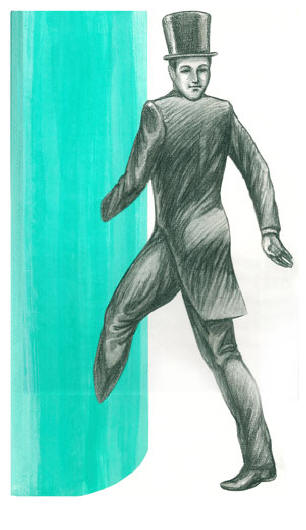 Чу се бучене на гласове, но беше невъзможно да се разберат думите … но изведнъж всички рязко скочиха и се втурнаха да тичат. Възможна причина страх беше появата на редовни посетители: от светлата колона излезе мъж, облечен в черна козина, бяла риза, на врата имаше черна пеперуда, а на главата цилиндър със същия цвят. Лице и ръцете, като първия предмет в кафяв пуловер, бяха бели цветове, абсолютно бели, сякаш безкръвни.