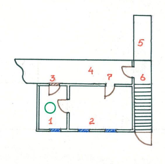 Общата схема на мазето на къщата. 1. Стаята, в която се е отворил портала; 2.Работилница за съседна стая; 3. Закована врата с изглед общ коридор; 4. Общият коридор на мазето, минаващ по цялата дължина у дома; 5. Подземен N.V. Стрелцова, където е намерено оръжието; 6. Стълби надолу откъм улицата и “съблекалнята” на коридора на мазето; 7. Вход за работилницата от коридора на сутерена.