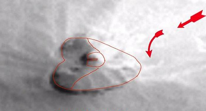 Предполагаемият кораб от представители на извънземна цивилизация разположен близо до връх Елизий в марсиански вулкан Регион Тарсис. Загадъчна снимка е направена през 2000 година. Американска безпилотна изследователска станция „Mars Global “Геодезист”, стартиран през ноември 1996 г. и считан за изгубен в Януари 2007 г. Въпреки факта, че устройството вече е на девет години изгубен, образите му на Марс все още заемат умовете на уфолозите от цялата земя. Изследователите са убедени, че за тях изображенията могат да скрият хиляди любопитни детайли, опровергаване на общата хипотеза, че Червената планета не е заселен от никого.