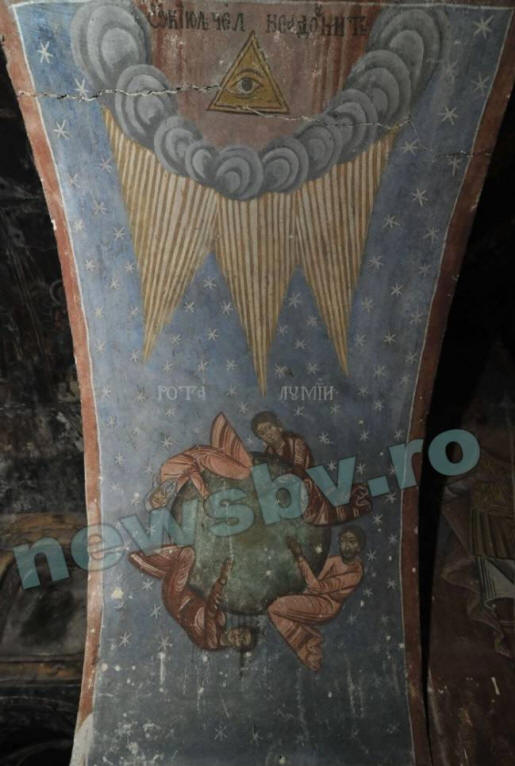 В румънския град Брашов в параклиса на Православната църква Свети Никола, построен през 1495 г., откри стенописи с сцени от Апокалипсиса. Според “Новия регион” с позоваване на румънското издание News Brasov, в този храм има място, където от десетилетия не е имало нито един турист. По стените и опорите на параклиса изобразяват поне 13 сцени от Апокалипсиса. Един от стенописите, които не могат да бъдат дешифрирани по-рано, имат поразително прилики с кадри от съвременни документални филми за прогнози за 2012 г. – със слънчеви пламъци и с изместване Магнитни полюси на Земята. Картините са направени през 1737г иконописецът Джордж Хол и брат му Григорий, за които Надписът на кирилица потвърждава автора и датата. Верандата е нарисувана от сина на Григорий Джон, който рисува сцени от библейското откровение “, каза местният свещеник Василий Олтяну. Най-интересната стенопис е върху опората на параклиса. Нарича се Колелото на света и показва въртенето на Земята. около слънцето, което се осъществява с помощта на светци. Слънцето в в средата на който е равностранен триъгълник с “всевиждащо око”, насочва смъртоносните лъчи към Земята. при това светиите се опитват да помръднат планетата вертикално, както сякаш искат да я обърнат. Тази сцена е свързана с теорията за промяна на магнитните полюси на Земята.