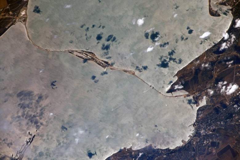 Руският тестов космонавт Сергей Рязански сподели с потребители на социалната мрежа “Twitter” две красиви снимки на моста през Керченския проток, взети от орбита От земята.