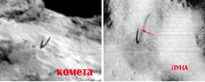 И тук има почти идентичен обект на виртуални археолози в дни са намерени в снимки, направени на комета 67P – Чурюмов-Герасименко. Според изследователите такива просто няма случайности, още повече, че близо до комета 67P �НЛО се забелязват постоянно, а през юни тази година известният уфолог Скот Уоринг откри на снимка, изпратена от космически кораб Rosetta, добре гледан космически кораб.