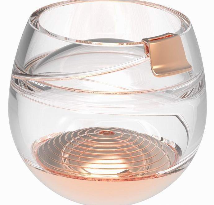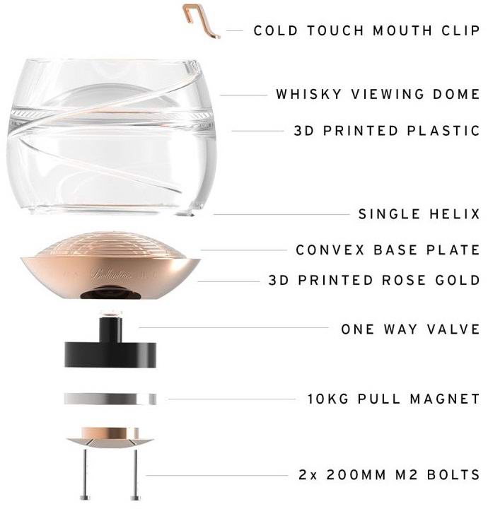 Резултатът е продукт, изработен от устойчива пластмаса на базата в розово злато, което за разлика от други метали не е в състояние да развали вкуса на уискито. Напитка избута надолу по чашата с помощта на изпъкнала основа, след което тя се издига нагоре с помощта на спирална тръба, разположена по ръба капацитет. Уиски достига до мундщук, направен от същото розово злато и готина напитка.