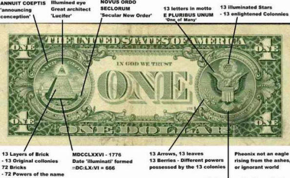 В допълнение, нацистите и Съветски символи: свастиката премина от тайни общества в банкноти Временно руско правителство, издадено до пролетта на 1918 г. години, а след това се използва при проектирането на емблемата на Червената армия. Ивъпреки че тя не се корени с нас, тя стана известна като официална символ на NSDAP, От друга страна, добре познатата петолъчка звезди, украсени в началото на двадесетте години, не само budenovki и шапки на Червената армия, но и униформата на атакуващия самолет на Хитлер, носещи пентаграма на ревера на дрехите си. Това вероятно е обяснява факта, че въпреки ясните разлики в идеология, до нападението на Германия срещу СССР у нас Немските военни специалисти са обучени, произведени оборудване за нуждите на Вермахта и др., тъй като има замесени напълно различни, недостъпни за непосветените принципи, цели и задачи. Най-пълно се отразява масонският намери символика в САЩ, които до началото на 20 век се превърнаха в център глобална концентрация на капитал. На гърба на банкнотата в един долар, поръчан от американския вицепрезидент Хенри Руският емигрант на Уолас Теософ Сергей Макроновски (известен още като – Николай Константинович Керич) и пуснати в обращение в края на 30-те години години, има цял куп масонски знаци и символи, и преди тотално досадно повторение на числото 13, което според учението Кабала означава 13 градуса на посвещение. В тесен смисъл, тринадесет – това е броят на степените на развитие на енергията и трансформацията на човека. В по-широк смисъл, тринадесет действа като символ на непълнота светът и неговата нужда да бъде ръководена от определена група хора, “пик”, защото само под тази суперсила той печели целостта и избягва опасността числото също да символизира 13. В левия ъгъл на сметката над надписа “Гребеният печат” (“Страхотно печат “) се поставя изображението на масонската пресечена пирамида, състоящ се от тринадесет тухлени нива, където всяка тухла означава отделна нация или държава с нейната монета, символизиращ единството на всички пари в света, подредени в йерархия, която се определя от върха на пирамидата – светещата масонска триъгълник с окото на Великия архитект на Вселената. Този символ увенчан с латинския надпис ANNUT COEPTIS, състоящ се от тринадесет писма и представляващи изкривен цитат от Върджил: „Бъди подкрепя смелите начинания, „което е недвусмислено подчертава, че само „Избраният“ е предопределен да управлява света. Пресечената пирамида е символ в масонските термини световен ред, установен от „свободните зидари“, изразяващ се по този начин идеята, че масонството е предопределено от ролята на управляващите клана. Това за пореден път намира потвърждение в надписа на Латински: NOVUS ORDO SECLORUM, разположен между основата на пирамидата и надписът върху „Големия печат“. Нейният превод говори за определен „Нов ред за векове“. От дясната страна на сметката изобразява орел, носещ щит с тринадесет ивици (светлина и тъмно). Освен това, изненадващо, в дясната си лапа държи клон акация с тринадесет листа и тринадесет пъпки цъфнали цветя. Но, както знаете, акацията не е само свещеното дърво на масонството, което ви позволява да отворите гроба на Хирам, но също така символизира силата на масонската традиция и организация, притежаване на тайни знания, способност за възкресяване или безсмъртие. В л