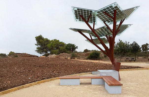 Дървото е оборудвано със соларни панели, които не само събират дневна светлина, но също така създайте сянка. Намира се в основата на дървото пейка със зарядно, както и поставена на самата USB точки на дървото позволяват на минувачите или кемпери в сянката на дървото хората презареждат мобилните си устройства безплатно. Една малка фонтан в горещи дни може да ви помогне да утолите жаждата си. През нощта дни дървото осветява пространството около него не по-лошо от мощно светва. Освен това, близо до слънчевото дърво, можете да се свържете Wi-Fi. Мнозина наричат това чудо-дърво екологична скулптура, който е предназначен за паркове, дворове, училища, университети и и т.н. В резервата беше инсталирано първото слънчево дърво На Израел. Създателите дори не се съмняват, че много скоро това дървото ще бъде широко популярно в много страни на света.