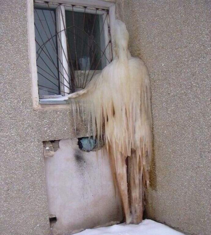 Някои от тези илюзии могат да изглеждат наистина плашещи. И така, преди няколко дни в „World Wide Web“ се появи необичайна снимка, направена от анонимен потребител близо до прозореца стара къща за пилинг. На снимката се вижда голям клъстер ледени сталактити по стената, ясно напомнящи на човек фигура. Можете да видите главата, торса, краката и легналото рамо на прозорец. Някои от леденцата дори приличат на дрехи, висящи надолу от гърба на “ледения човек”.