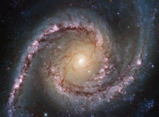Новият образ на Хъбъл показва NGC 1566 , най-красивата галактика от съзвездието Златна рибка, разположена приблизително на 40 милиона светлинни години от нас. NGC 1566е междинна спирална галактика, което означава, че това въпреки че в центъра му няма джъмпер от ясно оформени звезди, които наблюдавана в кръстосани спирални галактики, тя все още не може да бъде считана за отворена (некръстена) спирална галактика. На снимката изпъква малкото, но изключително ярко ядро на NGC 1566, което показва очевидното му принадлежност към класа на Сейферт галактики. Центровете на тези галактики са изключително ярки и активни, те излъчват силни изблици на радиация и потенциално съдържат свръхмасивни черни дупки надхвърлящи много милиони пъти маса на слънцето.